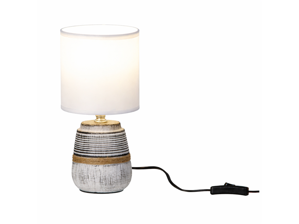 keramická stolná lampa s výškou 26 cm je vhodná ako doplnkové osvetlenie do interiéru. jednoduchý dizajn s textilným tienidlom sa hodí na nočný stolík, komodu alebo pracovný stôl a vytvára príjemnú atmosféru v priestore.